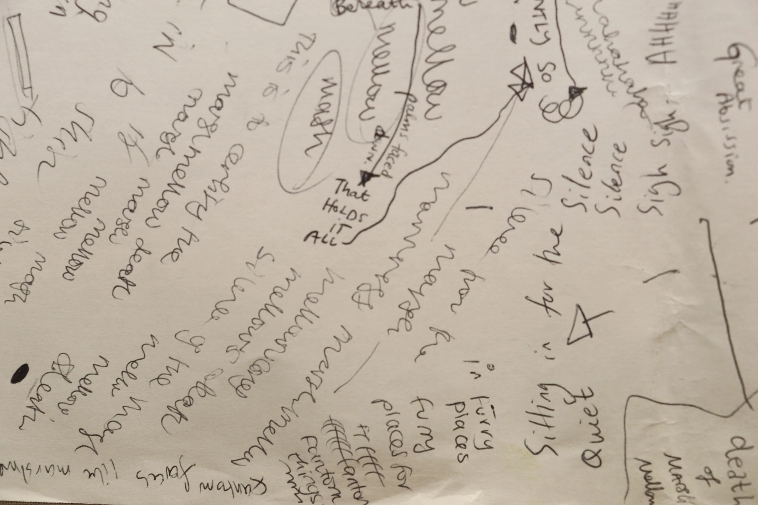 The surface of these papers expand into multiple temporalities. As the two authors deface the blank page, their marks feed into each other to create part transcript, denoting utterances of performances past, and part diagram, prompting future readings/possibilities.